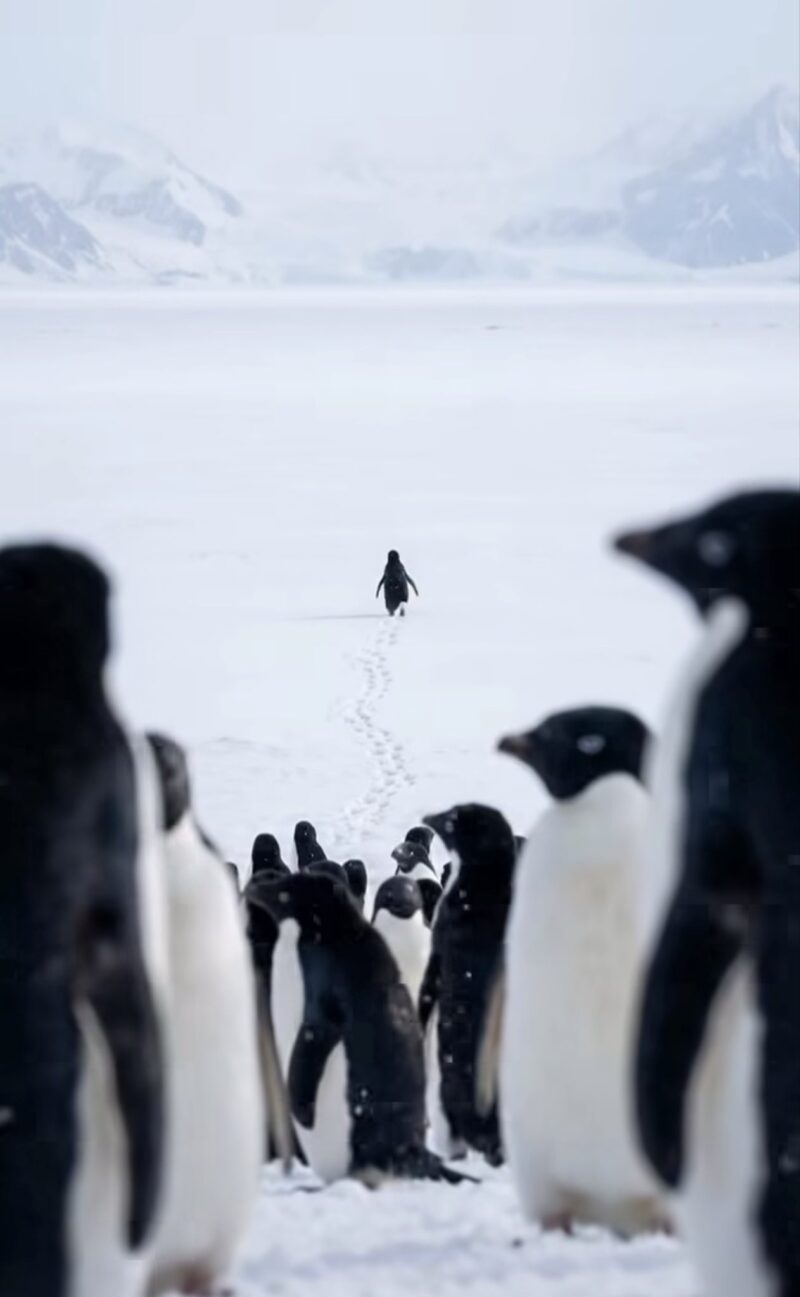 பெண் குயின் பனிமலையை நோக்கி நடப்பது,